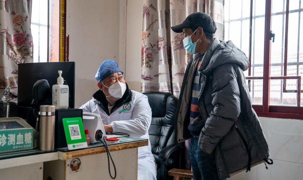 2022年12月30日,潑機鎮李官營(yíng)村村醫付向朋上門(mén)服務(wù)。新華社記者江文耀 攝