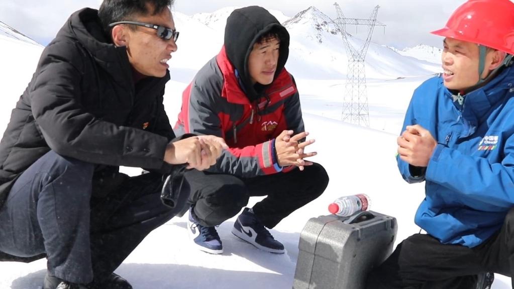 2021年,丹真曲批(左一)和負責網(wǎng)絡(luò )維護的同事一起保障石渠縣交通要道的通信網(wǎng)絡(luò )。(受訪(fǎng)者供圖)