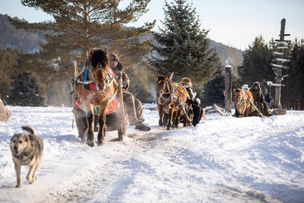 在漠河市北極村,游客乘坐馬拉爬犁。新華社記者張濤 攝