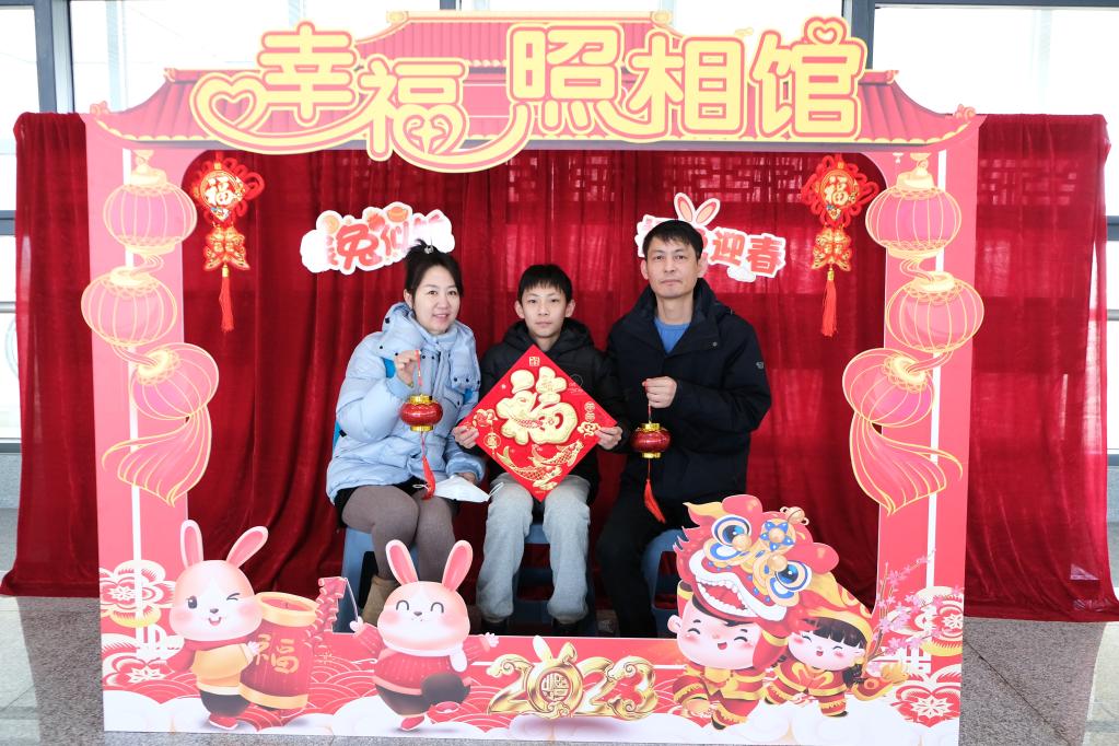 王女士和丈夫、女兒一起走進(jìn)“幸福照相館”留影。一家三口已在安徽淮南定居,準備乘高鐵去河南商丘老家?!拔覀兎蚱迋z工作忙,一年到頭也難回老家幾趟,趁著(zhù)春節假期,帶著(zhù)女兒回去看看她外公外婆?!蓖跖空f(shuō),車(chē)站推出的這項服務(wù)很便民、很暖心,她會(huì )把照片拿回去給老人留念。