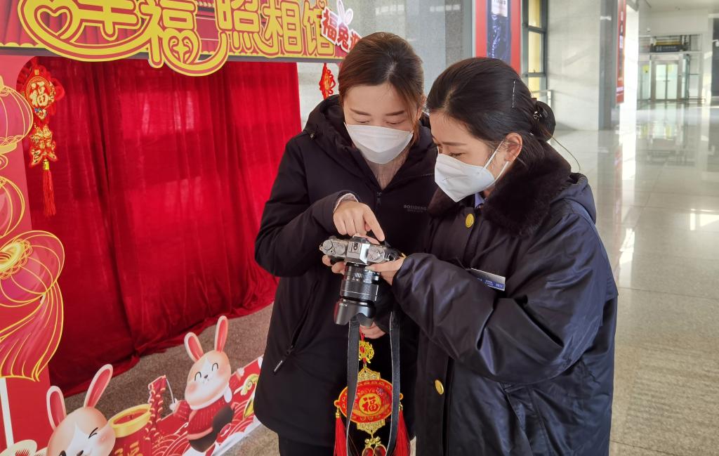 “很高興能用相機為旅客留下春運的美好記憶?!蓖跹┍f(shuō),今年春運是她參加的第十個(gè)春運。2013年,王雪冰大學(xué)畢業(yè)就來(lái)到淮南西站工作。十年來(lái),她先后擔任過(guò)客運員、售票員、客運值班員。平日里喜愛(ài)攝影的她,這次主動(dòng)承擔起為旅客拍照的工作?!皬?月8日到2月15日,‘幸福照相館’一直都營(yíng)業(yè),歡迎找我們拍照打卡?!蓖跹┍χ?zhù),打起了“廣告”。