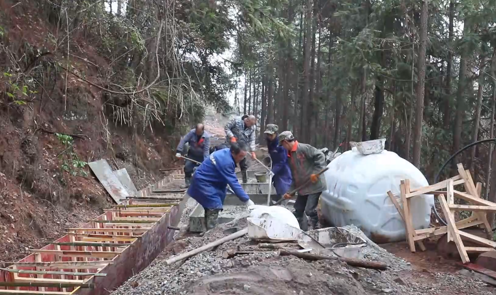 湖南懷化方石坪村,工人正在進(jìn)行排水灌溉渠道施工。視頻截圖