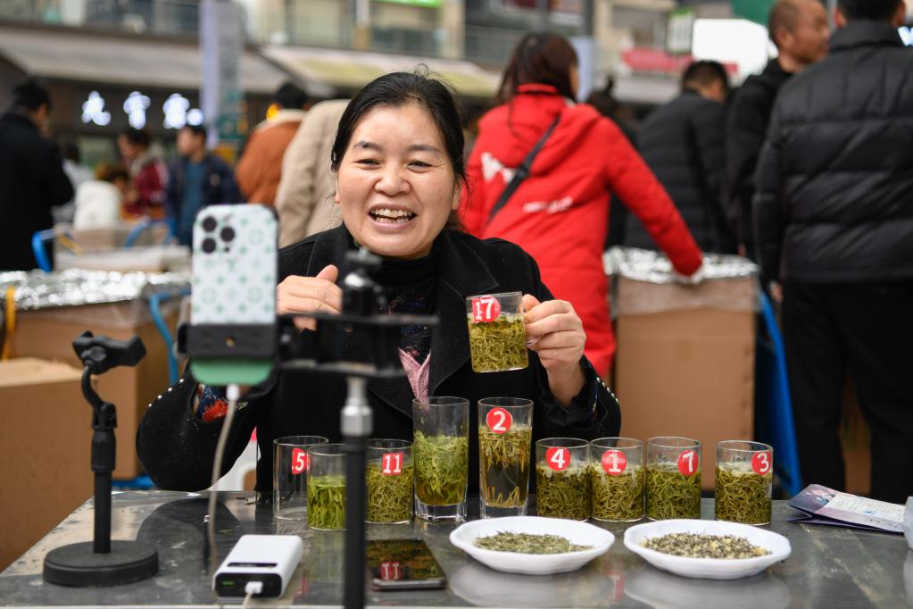 一位茶商在世界茶都茶葉交易市場(chǎng)內進(jìn)行直播,為網(wǎng)友介紹自家茶葉特色。新華社記者 胥冰潔 攝