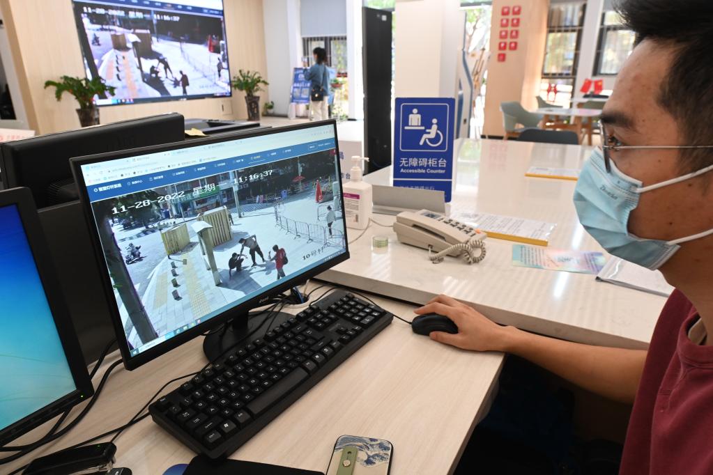 2022年11月28日,福州市福瑞社區便民服務(wù)中心社區智慧平臺可即時(shí)收到小區周邊智慧燈桿監控拍攝到的路面情況,以及路人需要幫助的信息等。新華社記者林善傳 攝