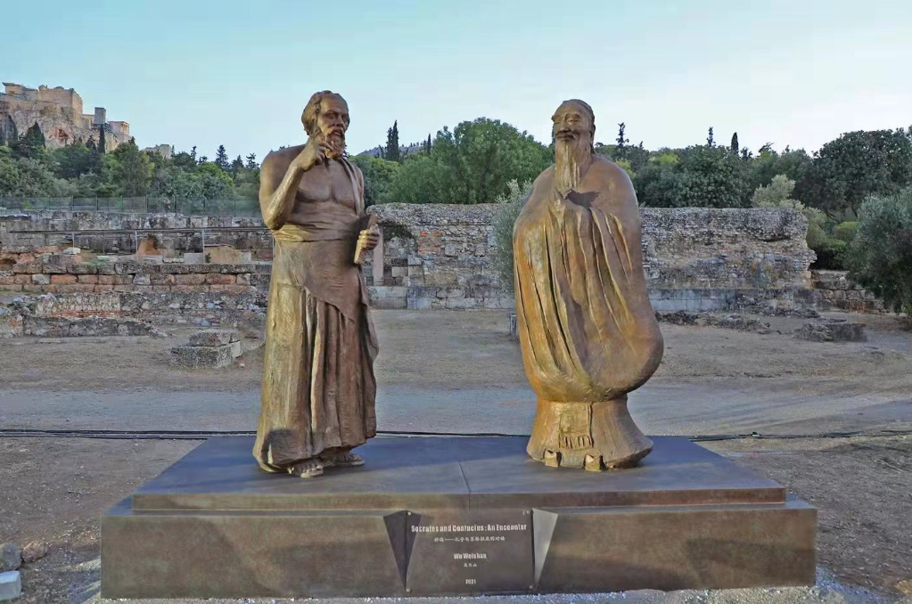 2021年9月,著(zhù)名雕塑家、中國美術(shù)館館長(cháng)吳為山青銅組雕作品《神遇——孔子與蘇格拉底的對話(huà)》在希臘雅典揭幕。圖片由中國美術(shù)館提供