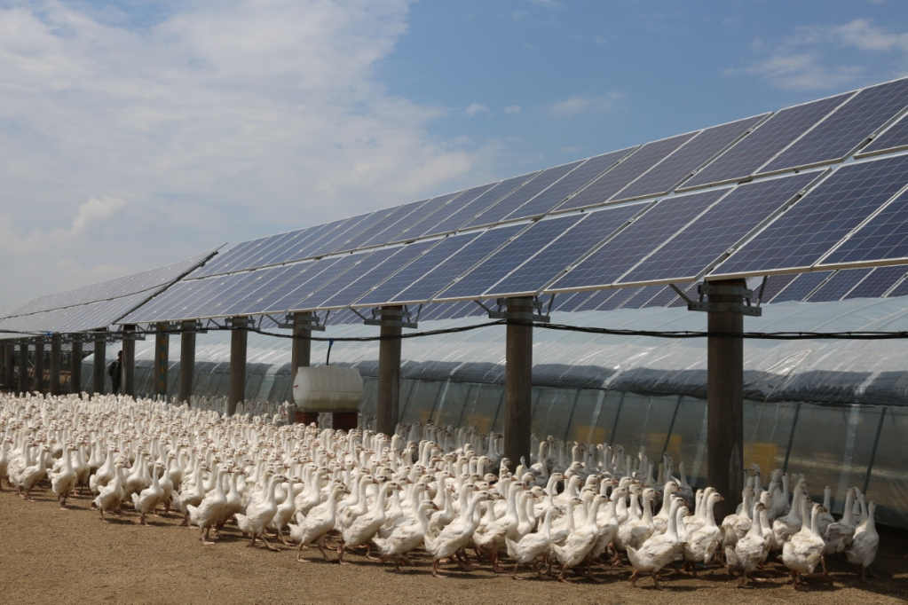 在舒蘭市環(huán)城街道重禮村占地近4萬(wàn)平米的光伏電站,光伏板和鵝舍間隔排列,光伏陣列整齊劃一,像是為鵝舍訂制的遮陽(yáng)傘?!斑@是‘企業(yè)+光伏’牧光互補養殖模式?!薄?0后”譚忠來(lái)一進(jìn)鵝舍,幾千只小鵝急忙跑到一邊并齊刷刷盯著(zhù)他,“目前三個(gè)光伏養殖區仔鵝存欄數近10萬(wàn)只,去年出欄33600只,實(shí)現利潤44萬(wàn)元?!?/p>