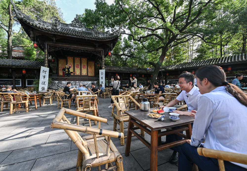 7月14日,在成都高新區鐵像寺水街,游客在茶鋪體驗當地特色蓋碗茶。新華社記者 王曦 攝