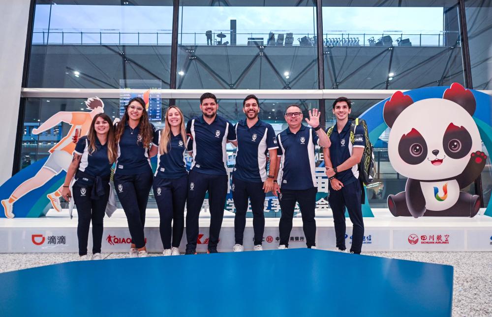 7月17日,首批抵蓉的巴西代表團成員在成都天府國際機場(chǎng)合影留念。新華社記者 胥冰潔 攝
