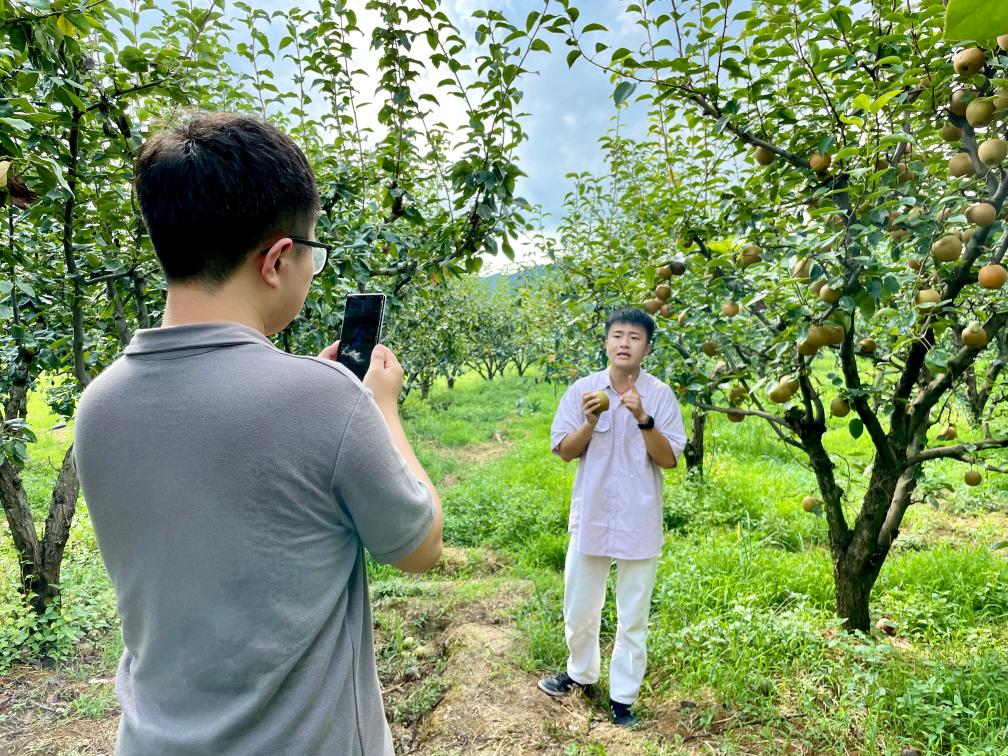 圖為當地電商主播在峽江縣金坪民族鄉水果種植園直播介紹翠冠梨。新華社記者陳柱佐 攝