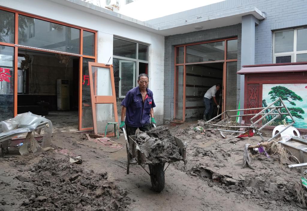 8月8日,淶水縣三坡鎮下莊村的村民在清理房屋內的淤泥。新華社記者齊雷杰 攝