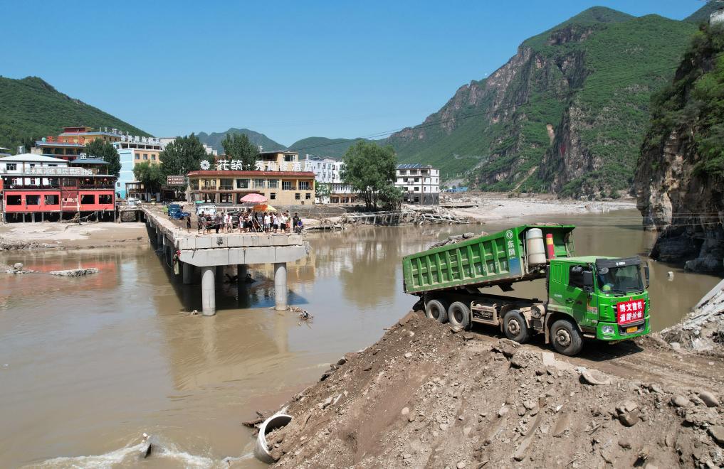 8月8日,工人操作機械設備搶修通往淶水縣三坡鎮劉家河村的橋梁(無(wú)人機照片)。新華社記者楊世堯 攝