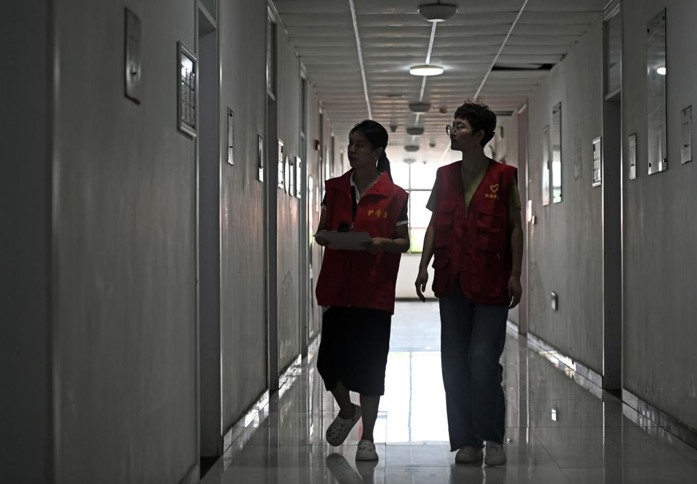 8月12日,在天津市靜海區大邱莊中學(xué)集中安置點(diǎn),志愿者在樓道內巡查。新華社記者 趙子碩 攝