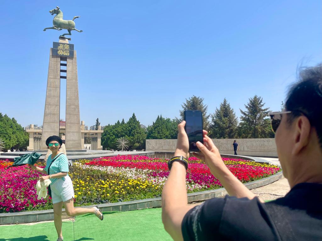 游客在甘肅省武威市天馬大景區“馬踏飛燕”拍照留念(2023年6月16日攝)。新華社記者 郭剛 攝