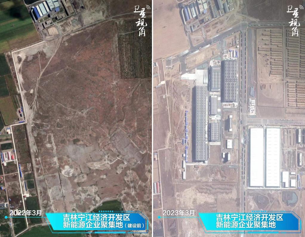 ↑2023年與2022年相比,吉林寧江經(jīng)濟開(kāi)發(fā)區的一片空地建設成頗具規模的新能源企業(yè)聚集地。