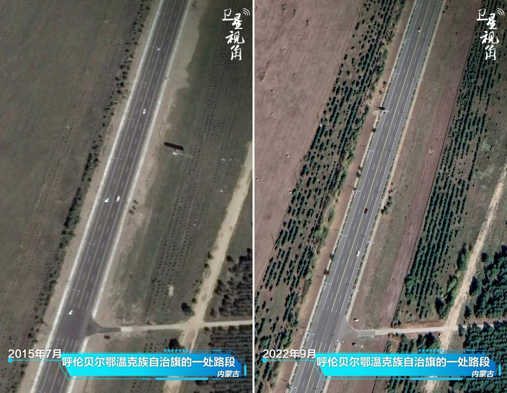 ↑2022年與2015年相比,內蒙古呼倫貝爾鄂溫克族自治旗一處道路兩側樹(shù)木顯著(zhù)增多。