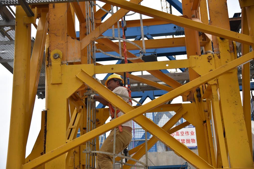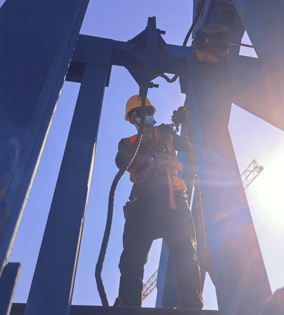 身處高空,記者內心無(wú)比緊張。而一旁的馬海扯坡和工友們則顯得比較輕松,正有條不紊地在塔頂安裝門(mén)架,為即將開(kāi)展的高空大重量吊裝做準備。