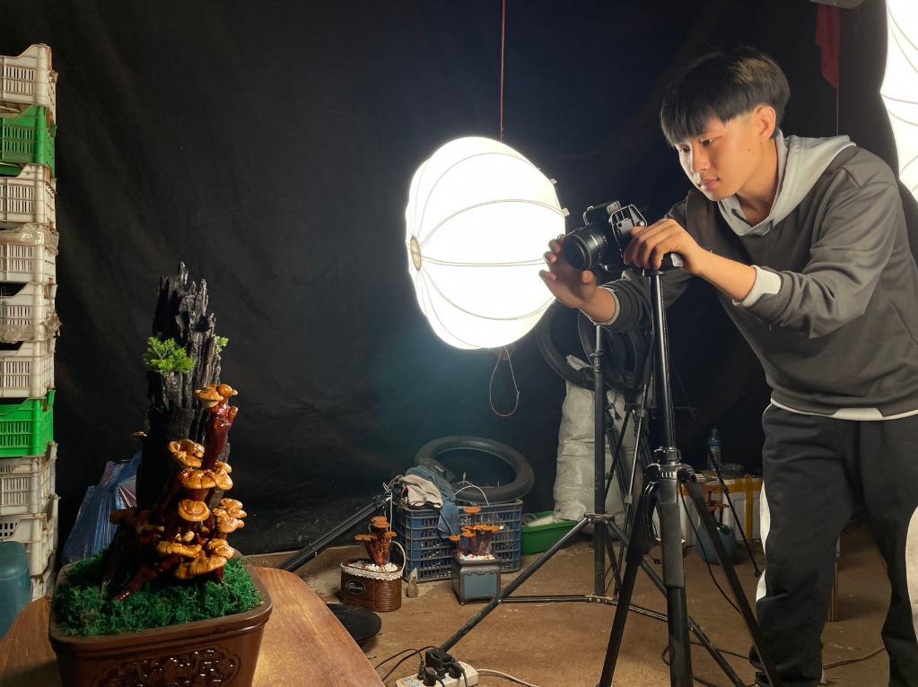 任嘉輝在拍攝靈芝視頻。新華社記者武江民 攝