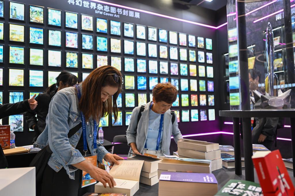 10月18日,觀(guān)眾在2023成都世界科幻大會(huì )主題展覽上挑選科幻書(shū)籍。新華社記者 胥冰潔 攝