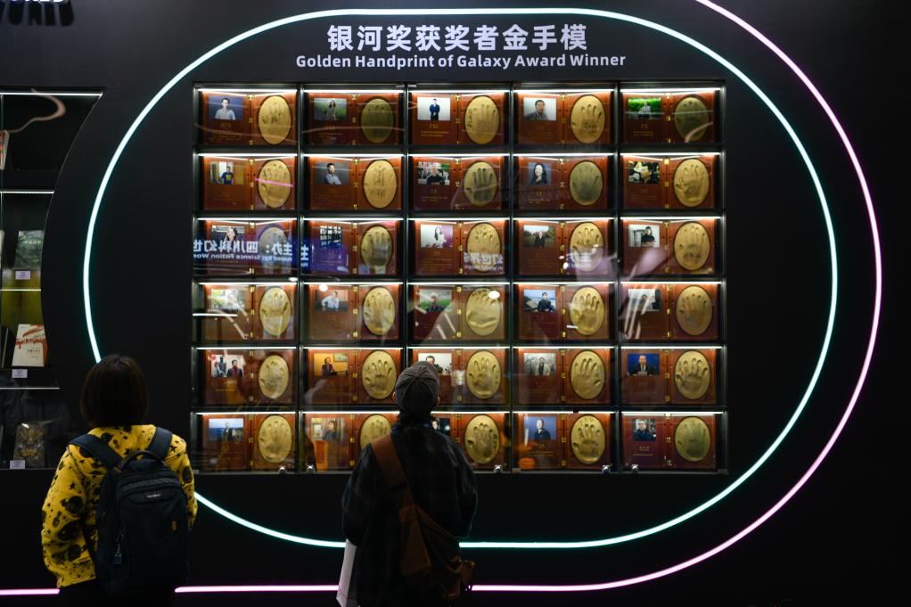 10月18日,觀(guān)眾在2023成都世界科幻大會(huì )主題展覽上觀(guān)看歷屆銀河獎獲獎?wù)呓鹗帜?。新華社記者 胥冰潔 攝
