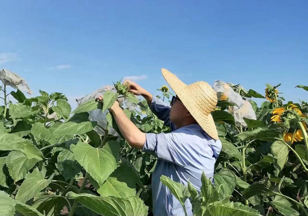 東北農業(yè)大學(xué)農學(xué)院研究生付國裕給試驗田里的向日葵套袋。(受訪(fǎng)者供圖)