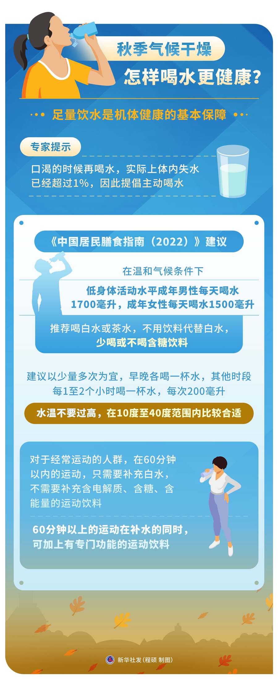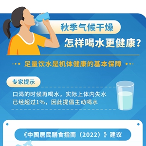 秋季氣候干燥,如何科學(xué)足量飲水?專(zhuān)家提示,口渴的時(shí)候再喝水,實(shí)際上體內失水已經(jīng)超過(guò)1%,因此提倡主動(dòng)喝水。建議以少量多次為宜,水溫不要過(guò)高,在10度至40度范圍內比較合適。