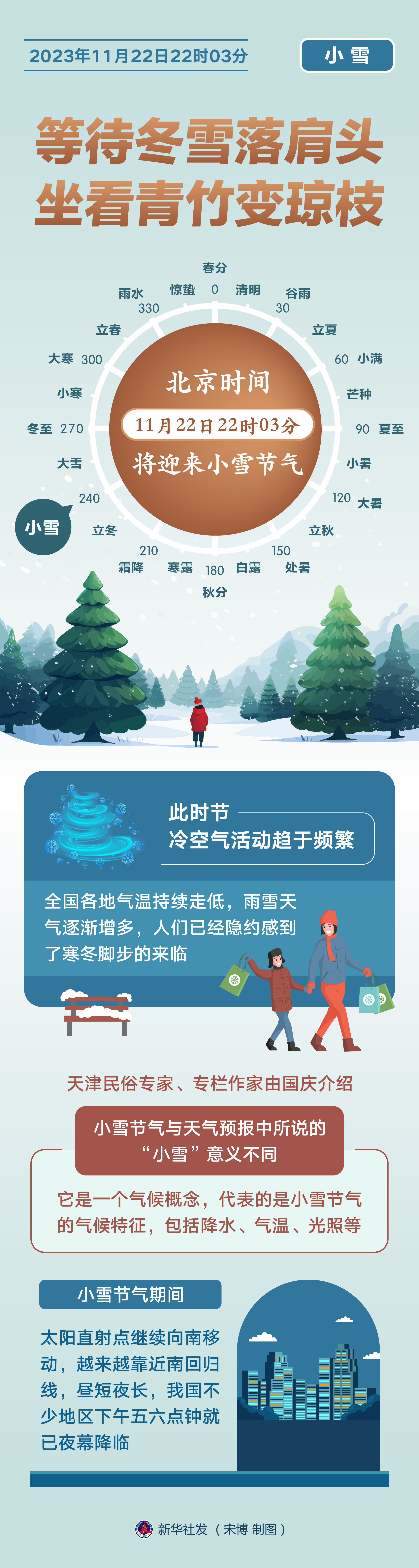 天津民俗專(zhuān)家、專(zhuān)欄作家由國慶介紹,小雪節氣與天氣預報中所說(shuō)的“小雪”意義不同,它是一個(gè)氣候概念,代表的是小雪節氣的氣候特征,包括降水、氣溫、光照等。小雪節氣期間,太陽(yáng)直射點(diǎn)繼續向南移動(dòng),越來(lái)越靠近南回歸線(xiàn),晝短夜長(cháng),我國不少地區下午五六點(diǎn)鐘就已夜幕降臨。