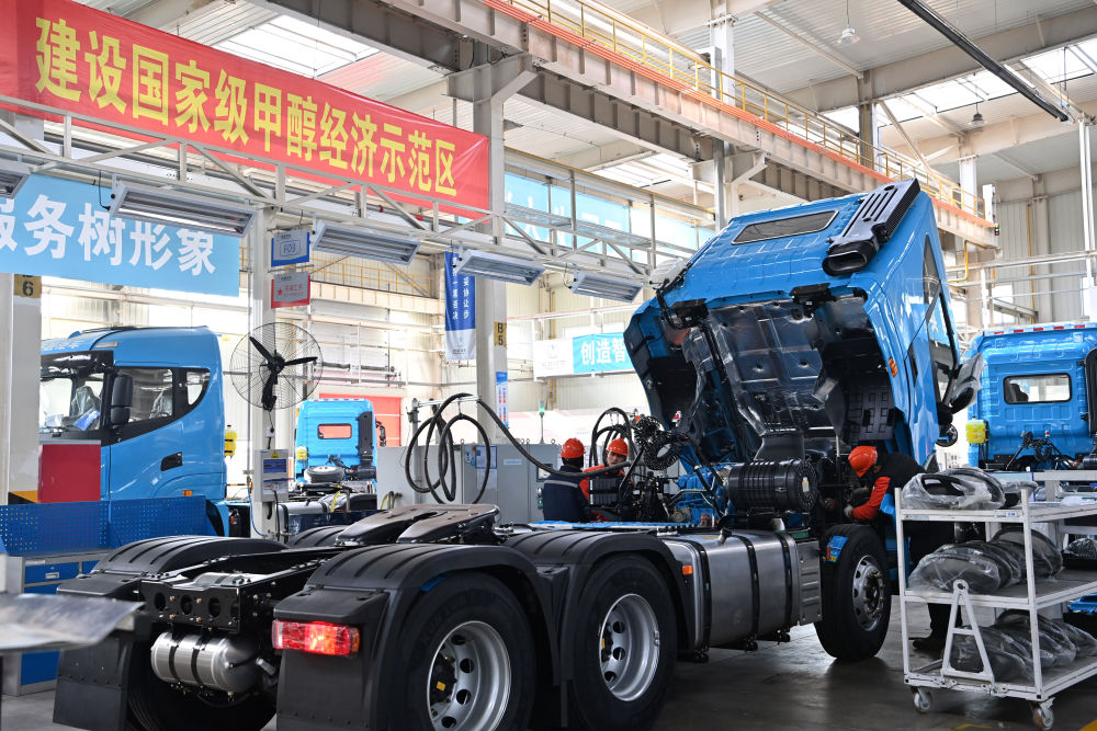 這是在位于山西省晉中市榆次區的山西新能源汽車(chē)工業(yè)有限公司(吉利晉中基地)拍攝的甲醇重卡(2022年12月9日攝)。新華社記者 楊晨光 攝