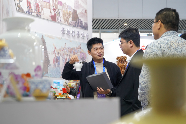 在版博會(huì )展覽現場(chǎng),參展商在展示景德鎮瓷器(新華社記者 唐文豪 攝)