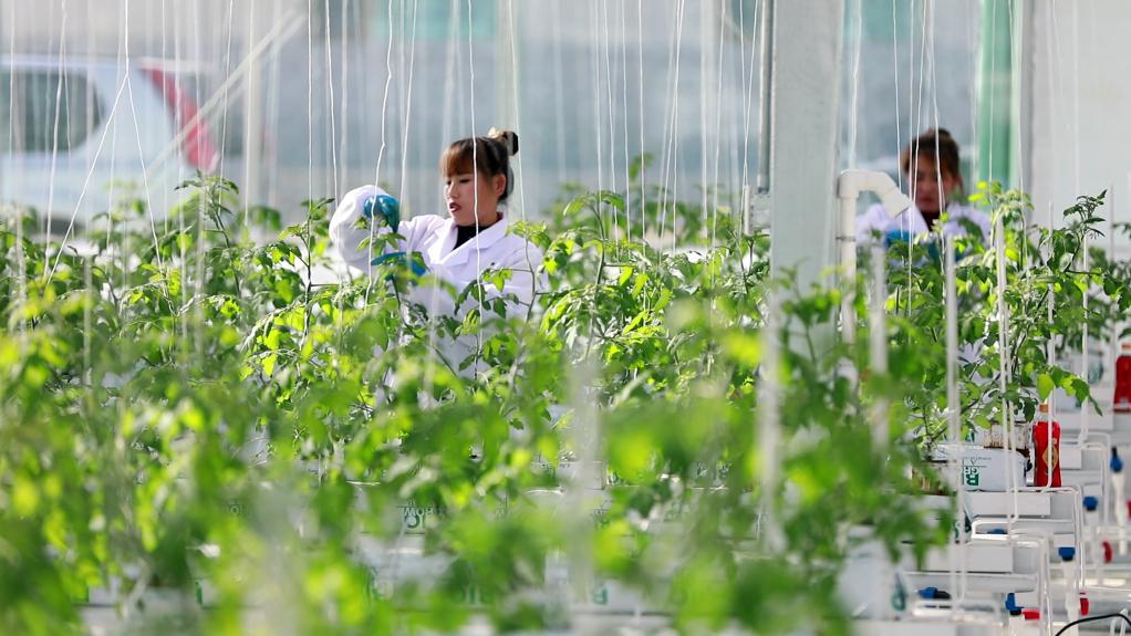 曠野之上,位于安定區內官營(yíng)鎮的定西內官綠色蔬菜現代產(chǎn)業(yè)園,一派生機盎然景象:整齊排列的育苗盤(pán)里蔬菜嫩芽已經(jīng)冒頭,閃著(zhù)光亮;翠綠的蔬菜“長(cháng)在”不同造型的立架上,“筑綠”為墻;一排排番茄秧一米多高,簇擁生長(cháng)……