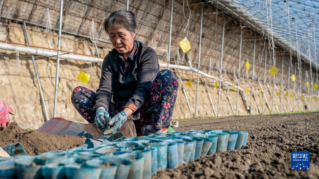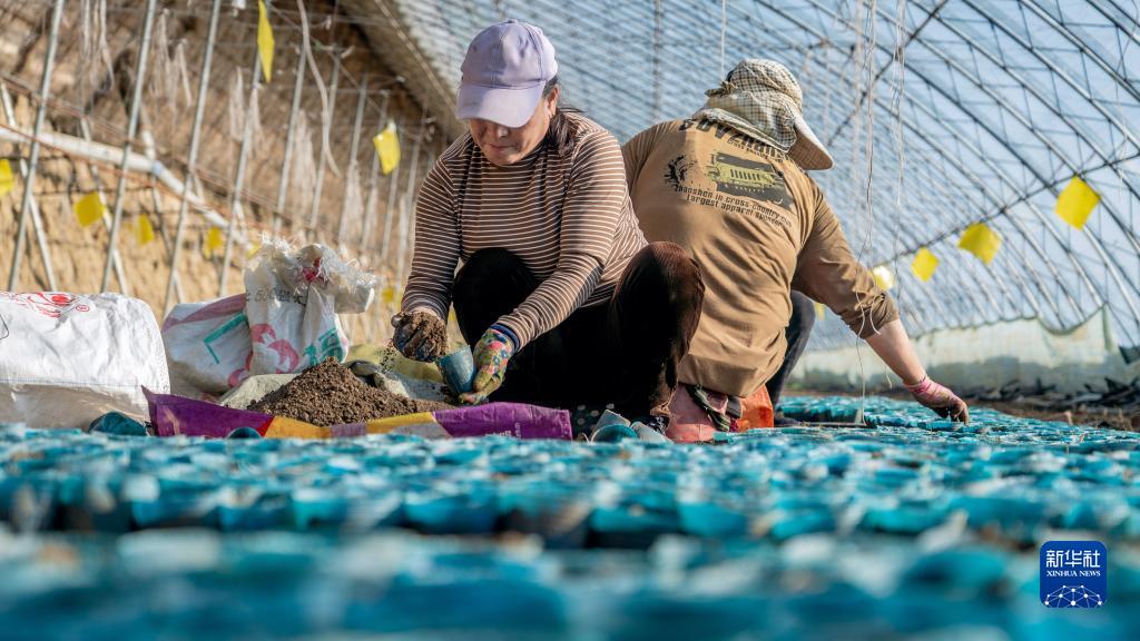 12月4日,在吉林省梨樹(shù)縣王家園子村一座育苗棚內,農戶(hù)在給育苗盆裝填培養土。新華社發(fā)(唐成卓 攝)