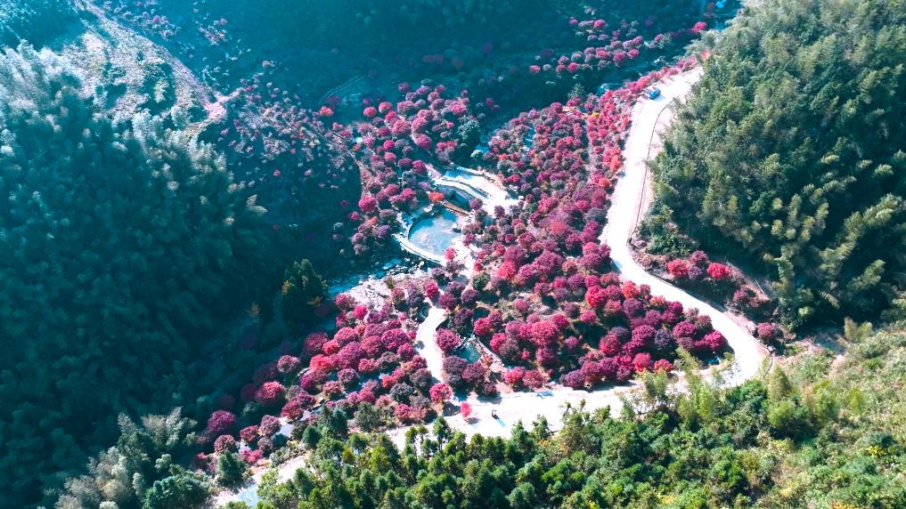 位于永州市藍山縣湘江源瑤族鄉坪源村的藍山谷景區,自11月下旬以來(lái),景區內打造的紅楓群進(jìn)入最佳觀(guān)賞期?;鸺t的楓葉綴滿(mǎn)枝頭,在峽谷地帶延綿5公里。從天空俯瞰,一簇簇紅楓在青山綠水間別具一格、分外好看。