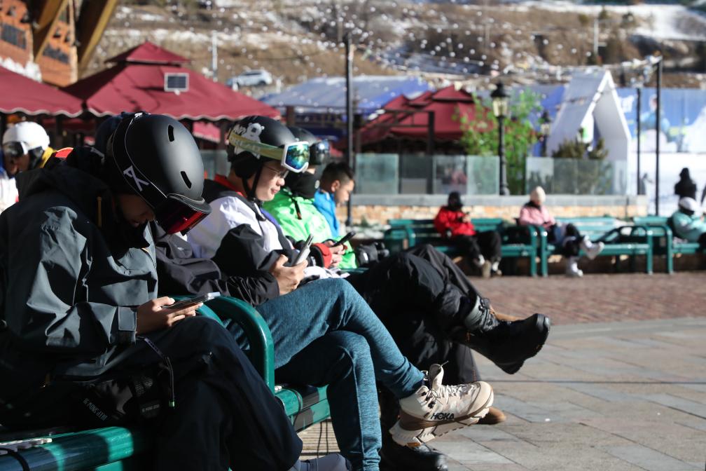 滑雪愛(ài)好者在河北崇禮太舞滑雪場(chǎng)游客中心旁長(cháng)椅處休息放松。新華社記者張瑋華 攝