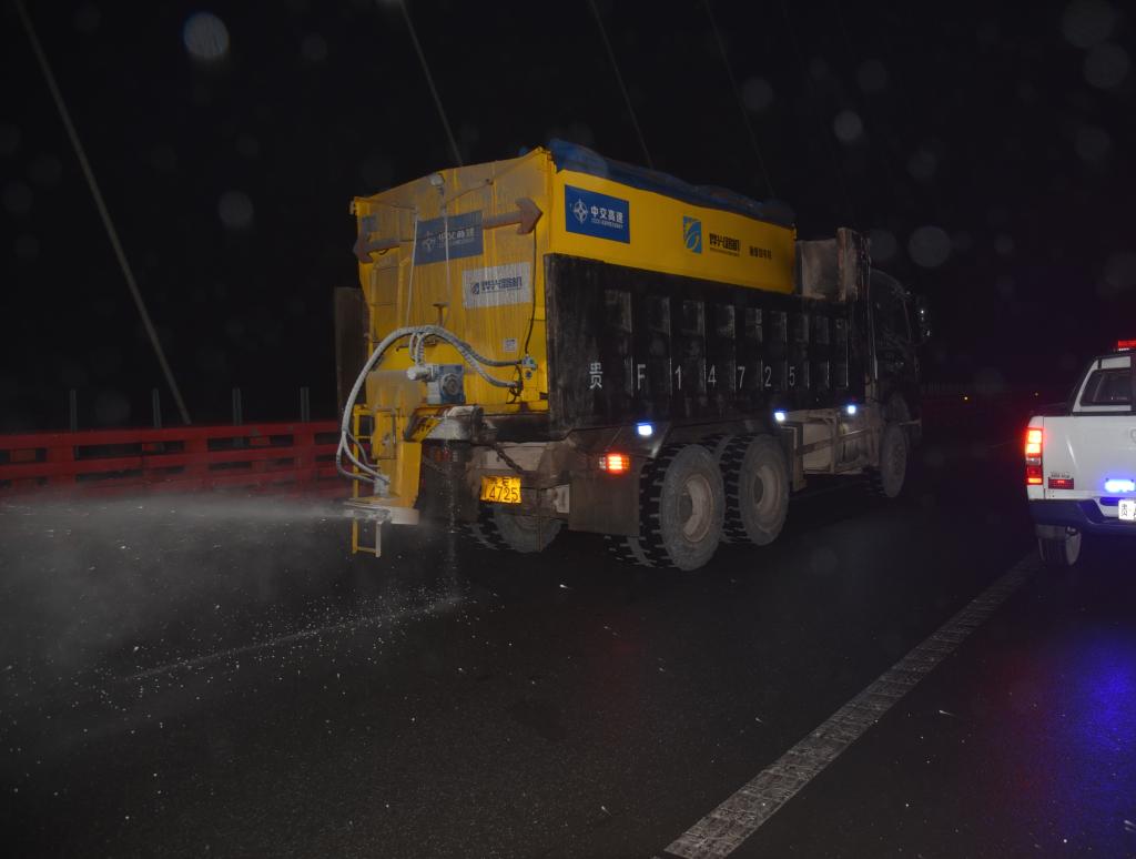 12月18日晚,筑大高速黔西段的“一路三方”有關(guān)作業(yè)隊正在對鴨池河大橋路面進(jìn)行融雪除冰工作。新華社記者李凡 攝