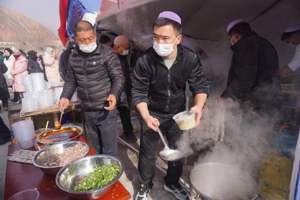 12月19日,在甘肅臨夏積石山縣大河家鎮大河村安置點(diǎn),蘭州餐飲企業(yè)“筷上癮”為受災群眾送來(lái)愛(ài)心牛肉面。新華社記者 馬希平 攝