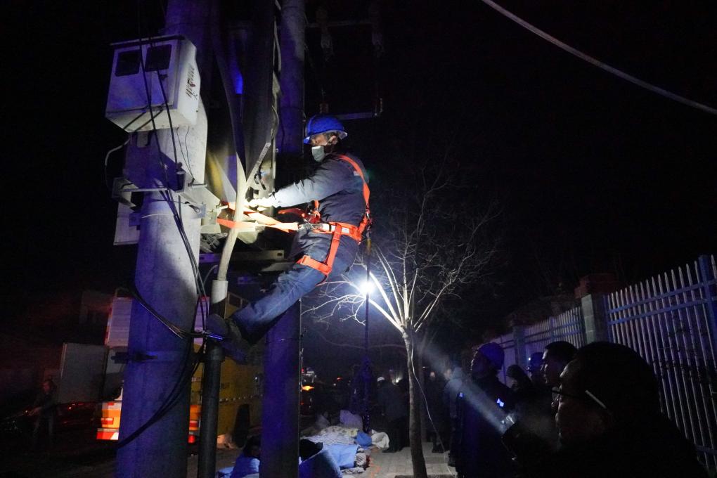 12月19日,在甘肅省臨夏回族自治州積石山保安族東鄉族撒拉族自治縣中西醫結合醫院門(mén)口,電力部門(mén)工作人員搶修電力設施。新華社記者 馬希平 攝