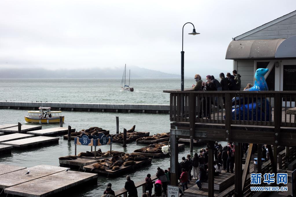 8月15日,人們在美國舊金山海邊觀(guān)看海獅。