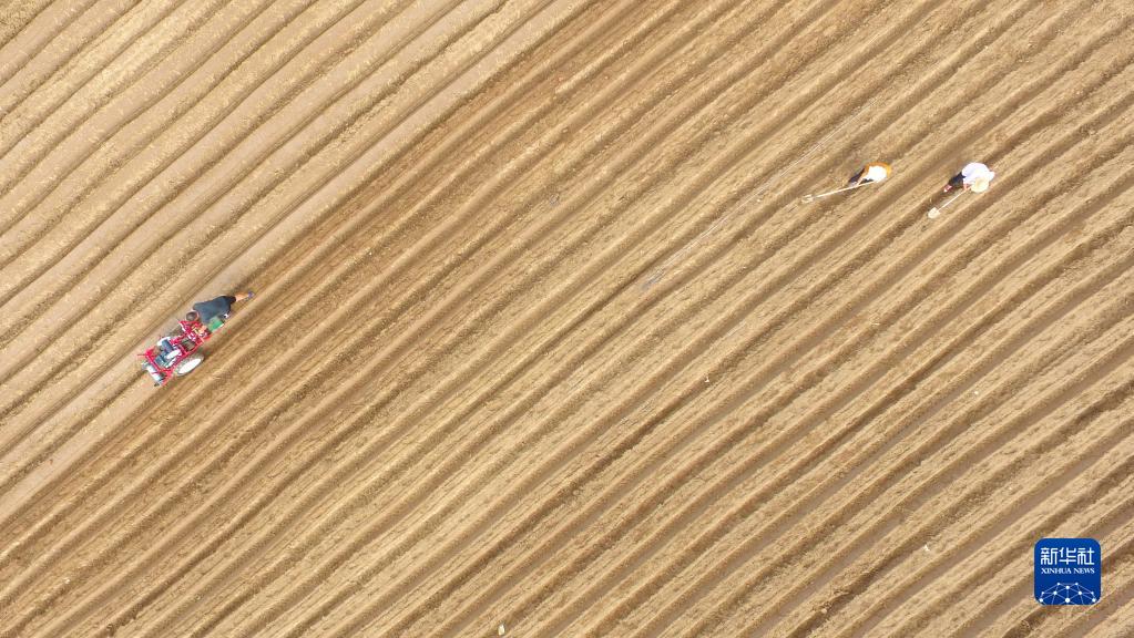 8月23日,在山東省聊城市茌平區,農民在田間播種蘿卜(無(wú)人機照片)。