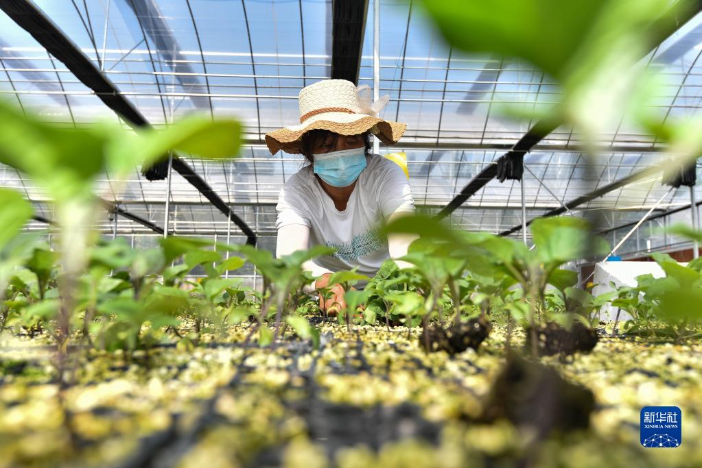 8月23日,農民在山東省青州市高柳鎮一處育苗基地大棚內管理茄子苗。