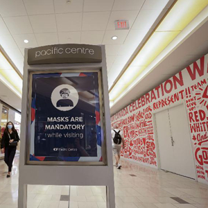 8月25日,在加拿大不列顛哥倫比亞省溫哥華,商場(chǎng)門(mén)外貼著(zhù)須戴口罩進(jìn)入的告示。