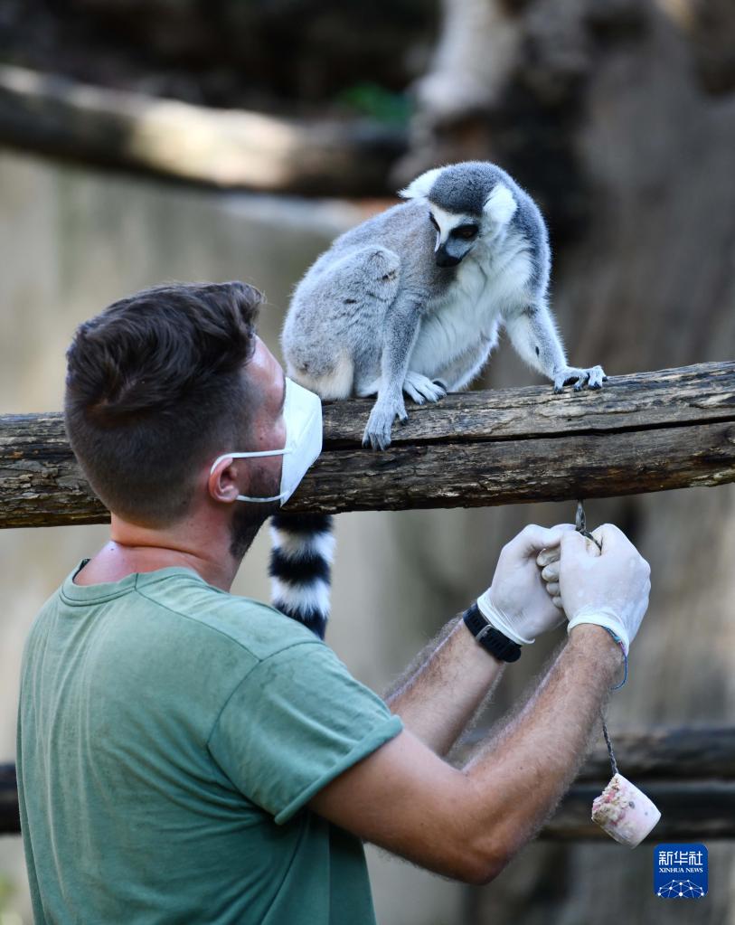 8月26日,意大利羅馬動(dòng)物園的工作人員為環(huán)尾狐猴送去冰凍果蔬。