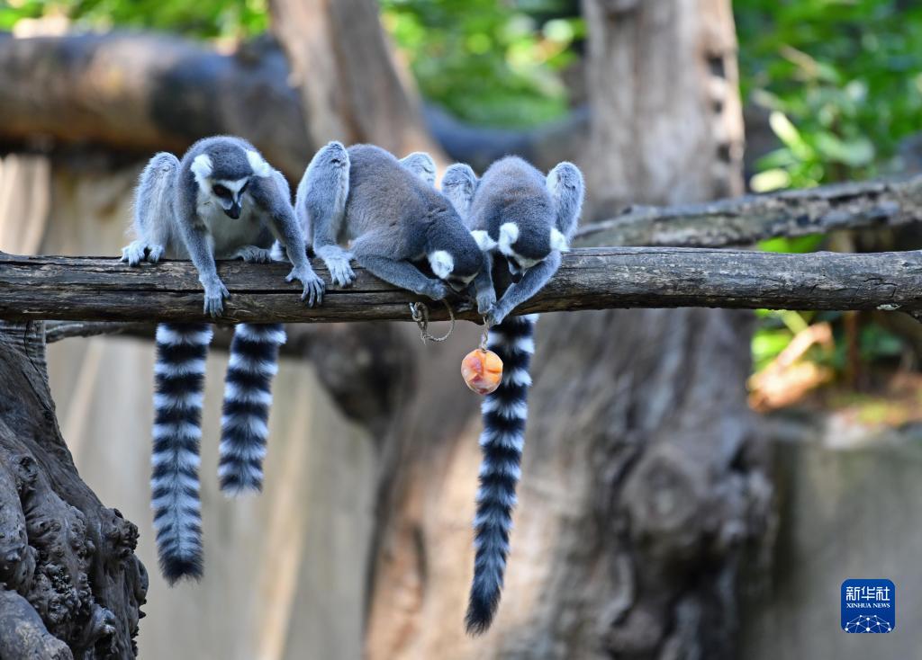 8月26日,環(huán)尾狐猴在意大利羅馬動(dòng)物園準備享用冰凍果蔬。