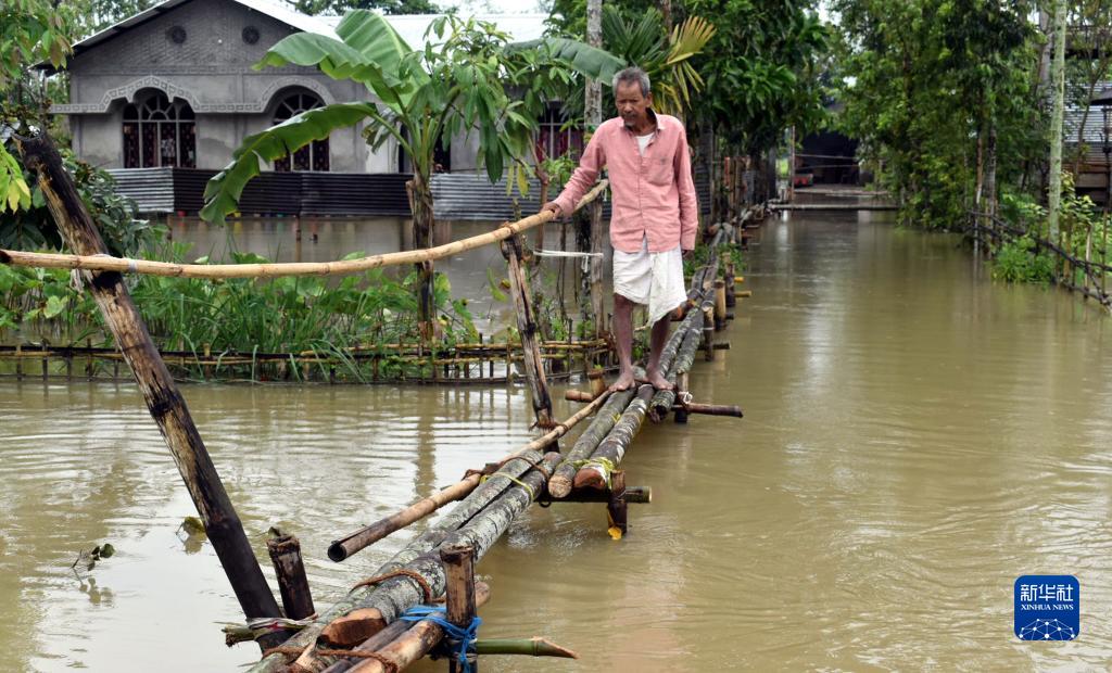 8月28日,一名男子在印度阿薩姆邦一個(gè)洪水泛濫的村莊走過(guò)簡(jiǎn)易木橋。