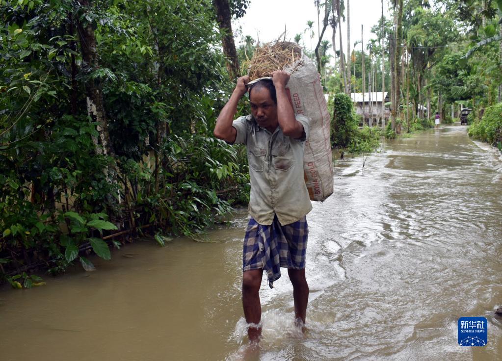 8月28日,一名男子在印度阿薩姆邦一村莊的洪水中行走。