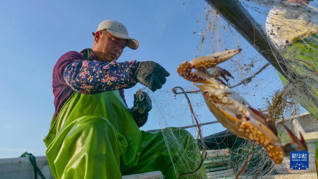 8月27日早晨,胡國新的世侄胡高峰準備取下纏在漁網(wǎng)上的螃蟹。新華社發(fā)(周義攝)
