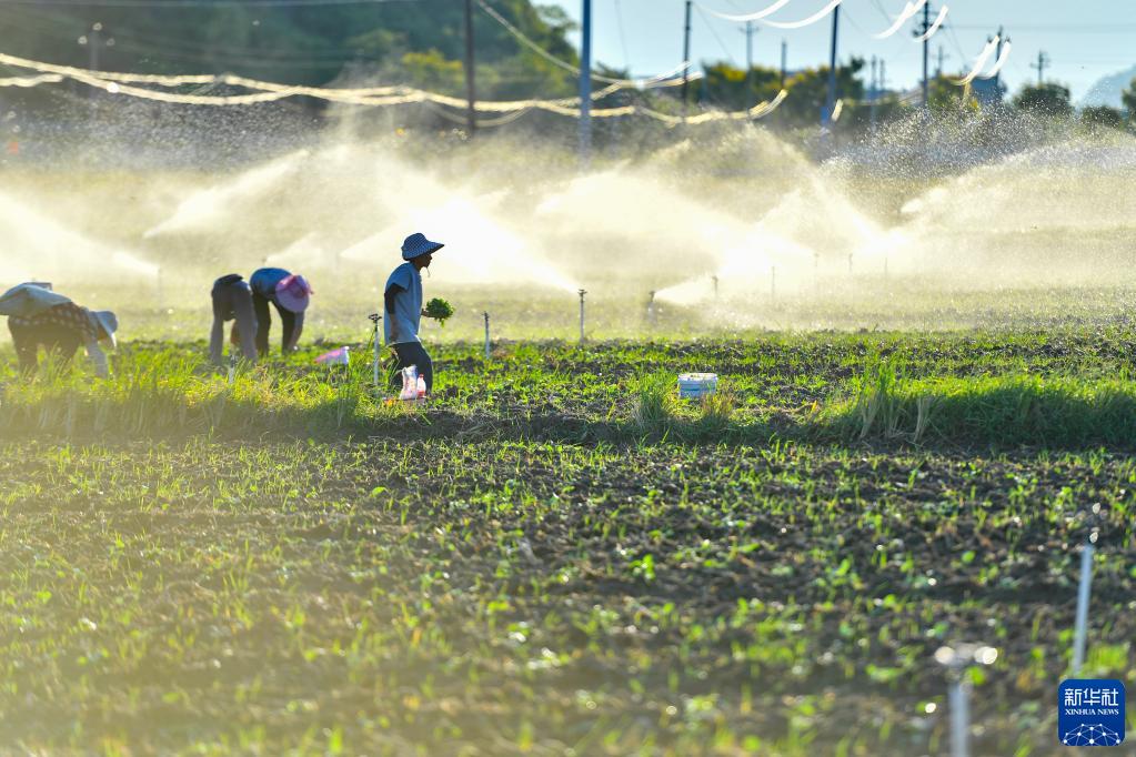 當日,天氣晴好,在湖南省永州市道縣清塘鎮濂溪大洞蔬菜基地,農戶(hù)搶抓農時(shí)在田間勞作。