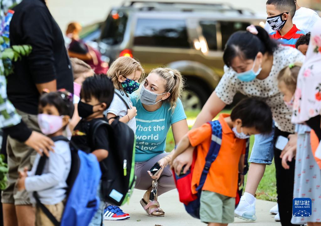 8月30日,在美國芝加哥,家長(cháng)在開(kāi)學(xué)日送孩子上學(xué)。
