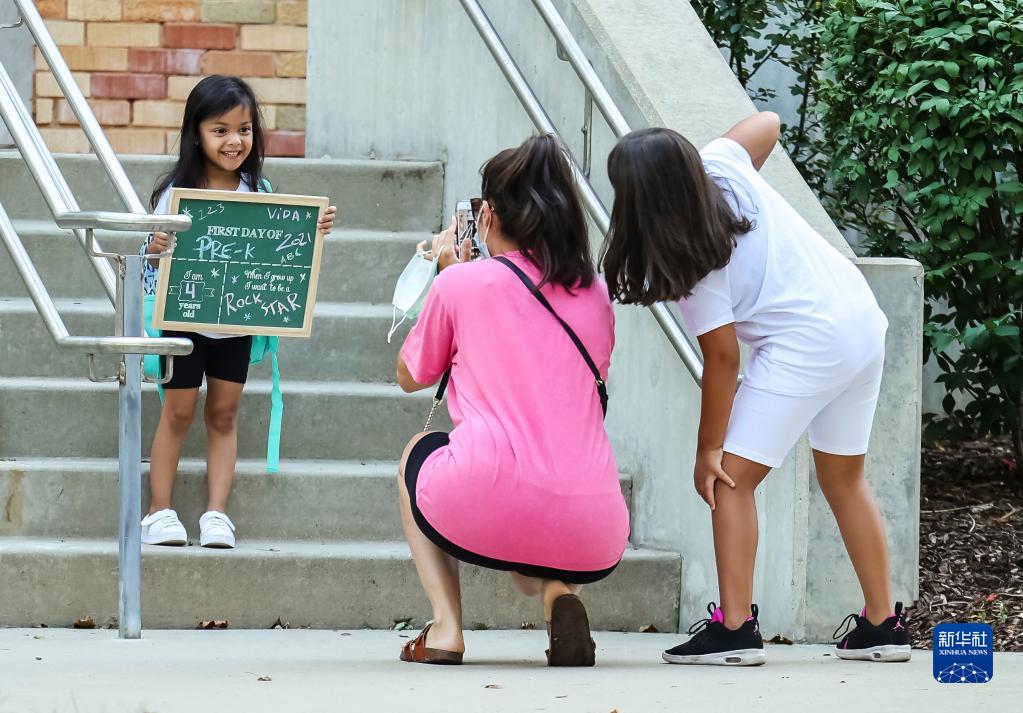 8月30日,在美國芝加哥,家長(cháng)在開(kāi)學(xué)日給孩子拍照。