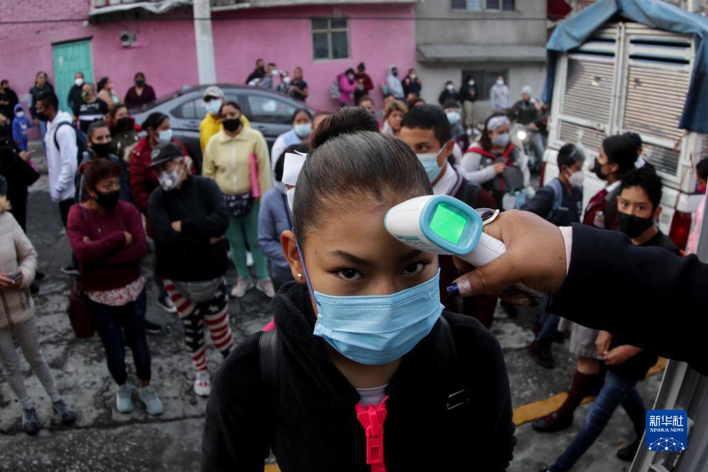 8月30日,在墨西哥特拉爾內潘特拉,學(xué)生進(jìn)入學(xué)校前接受體溫檢測。