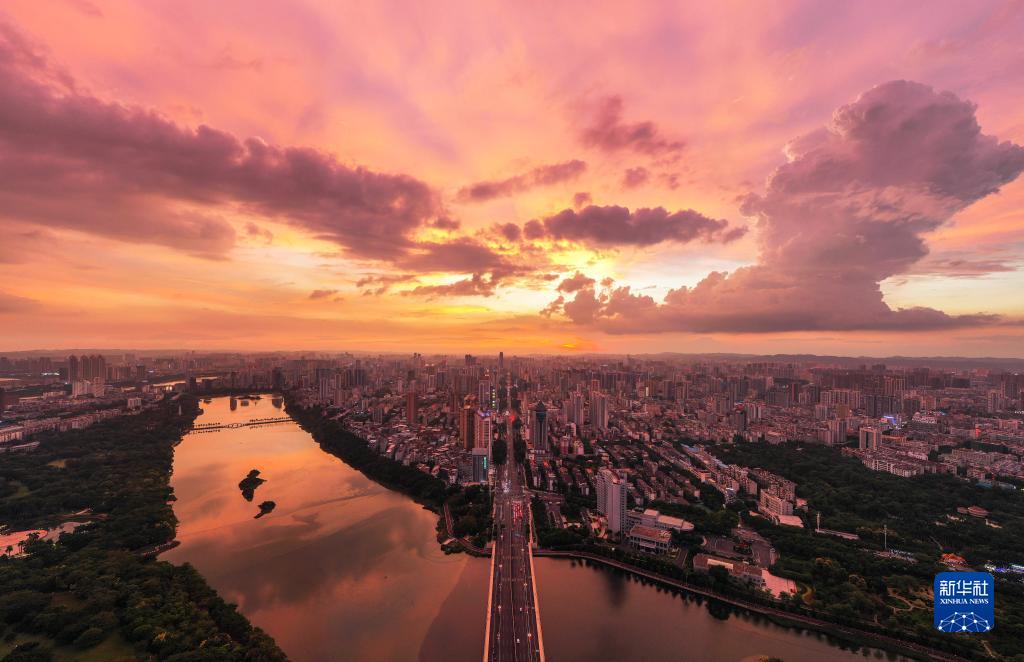 9月5日,陣雨過(guò)后,美麗晚霞映照南寧上空(無(wú)人機照片)。