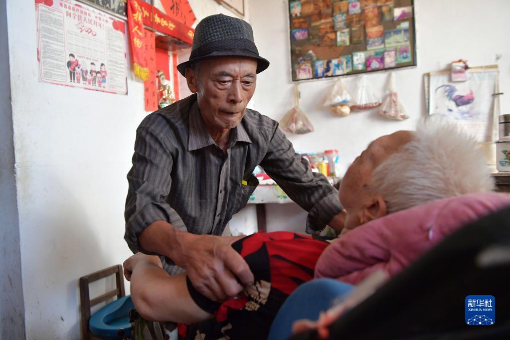 在江西省南昌縣三江鎮徐羅村,羅安民準備推老伴外出曬太陽(yáng)(9月5日攝)。